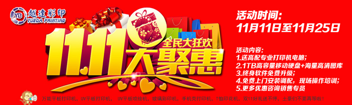 是不是想剁手呢?您是否也在為想購買而錯過了11.11大優惠而暗暗后悔呢?不要后悔,越達萬能打印機的搶購大優惠、送好禮活動才剛剛開始。越達萬能打印機是您創業的一個捷徑,少投入,快盈利,是您創業前期的好幫手!您錯過了雙11,就不能再錯過今天!只要您在11月11日到11月25日期間,購買越達萬能平板打印機,UV平板打印機, UV平板噴繪機,玻璃彩印機,手機殼打印機,T恤印花機的客戶,均可獲贈: